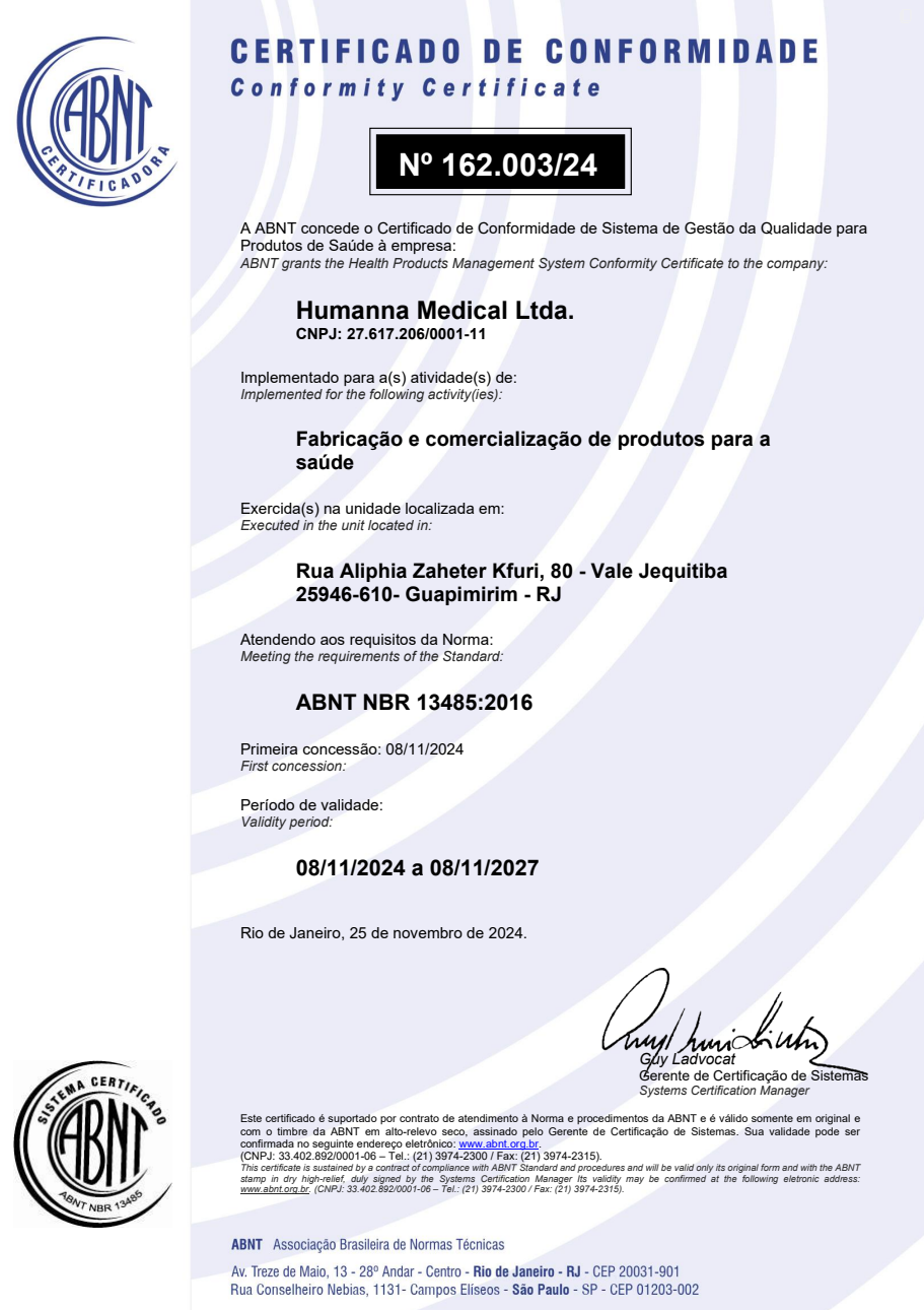 A HUMANNA MEDICAL compromete-se a garantir a qualidade, a segurança e a eficácia de seus produtos e processos, assegurando a confiança de seus clientes e a conformidade com a legislação aplicável.